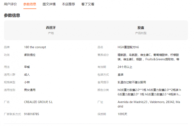 按照海关总署《进口食物境外出产企业注册办理》,向中国出口食物的境外出产企业必需经海关总署注册,这是进口食物进入中国市场的“准入门槛”。但记者登录海关总署“进口食物境外出产企业注册消息”查询系统核查发觉,概念180标称的境外出产从体“CREALIZE GROUP SL”未正在注册名单内,属于典型的“无合规天分”进口产物,其出产前提、产物尺度均未达到中国食物平安要求。