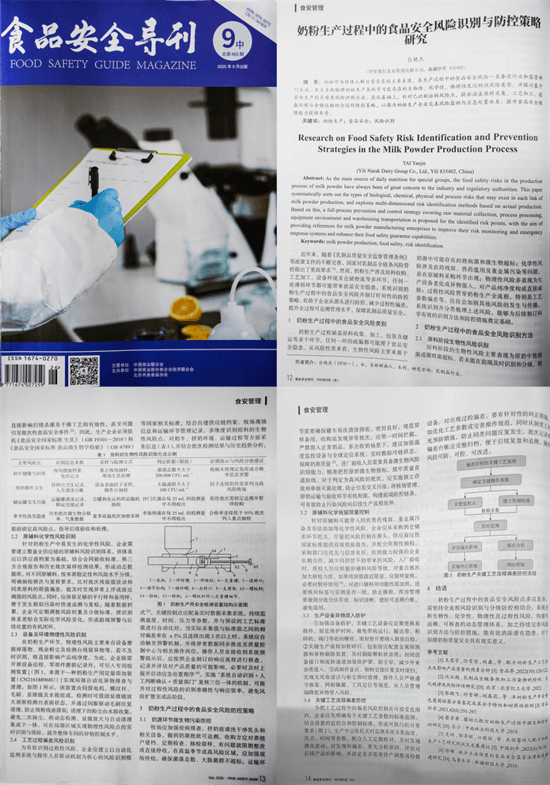 近日,伊犁那拉乳业集团无限公司董事长台艳杰的学术论文《奶粉出产过程中的食物平安风险识别取防控策略研究》正在《食物平安导刊》2025年9月(中)第19卷正式颁发。该论文系统梳理了奶粉出产各环节可能存正在的生物性、化学性、物及过程性风险类型,并提出了笼盖原料采集、工艺加工、设备取仓储运输的全过程防控策略。这项研究不只为奶粉出产企业完美风险监测取应急措置系统供给了适用参考,也展示了那拉集团正在奶粉平安出产手艺范畴的深挚堆集。